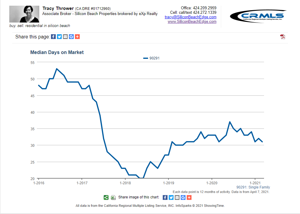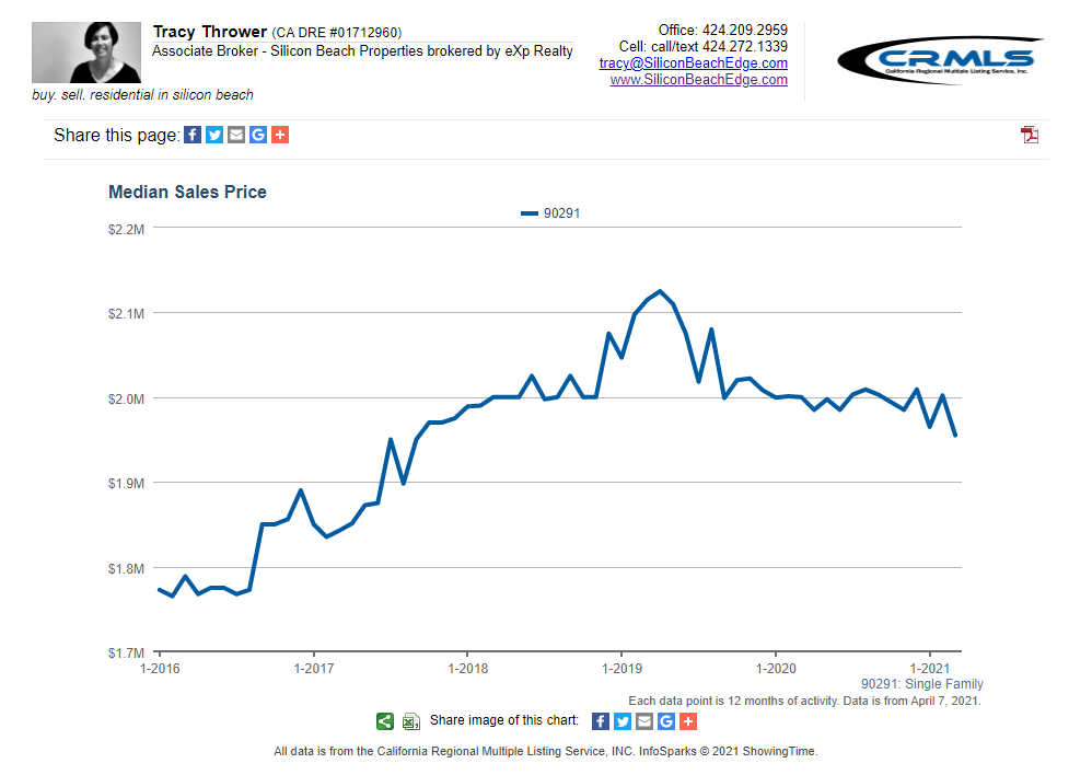 All graphs presented herein show data for the last five years on a rolling 12-month average to smooth the bumps. The data shown is also for single-family homes. If you want condo or combined data for Venice CA 90291, or custom graphs for other areas, just ask!
