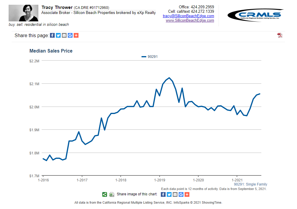 All graphs presented herein show data for the last five years on a rolling 12-month average to smooth the bumps. The data shown is also for single-family homes. If you want condo or combined data for Venice CA 90291, or custom graphs for other areas, just ask!