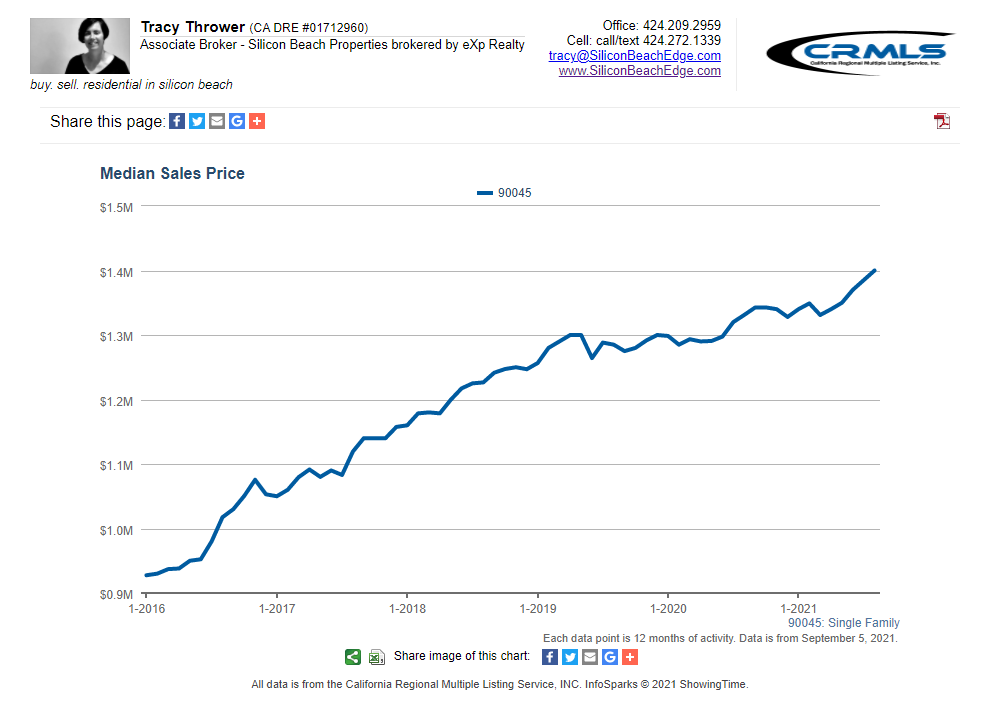 All graphs presented herein show data for the last five years on a rolling 12-month average to smooth the bumps. The data shown is also for single-family homes. If you want condo or combined data for Westchester 90045, or custom graphs for other areas, just ask!