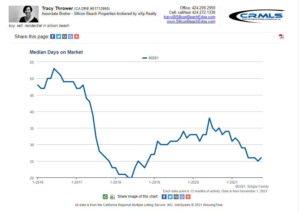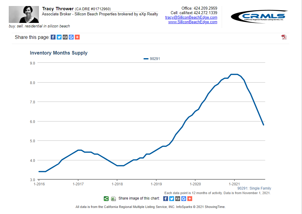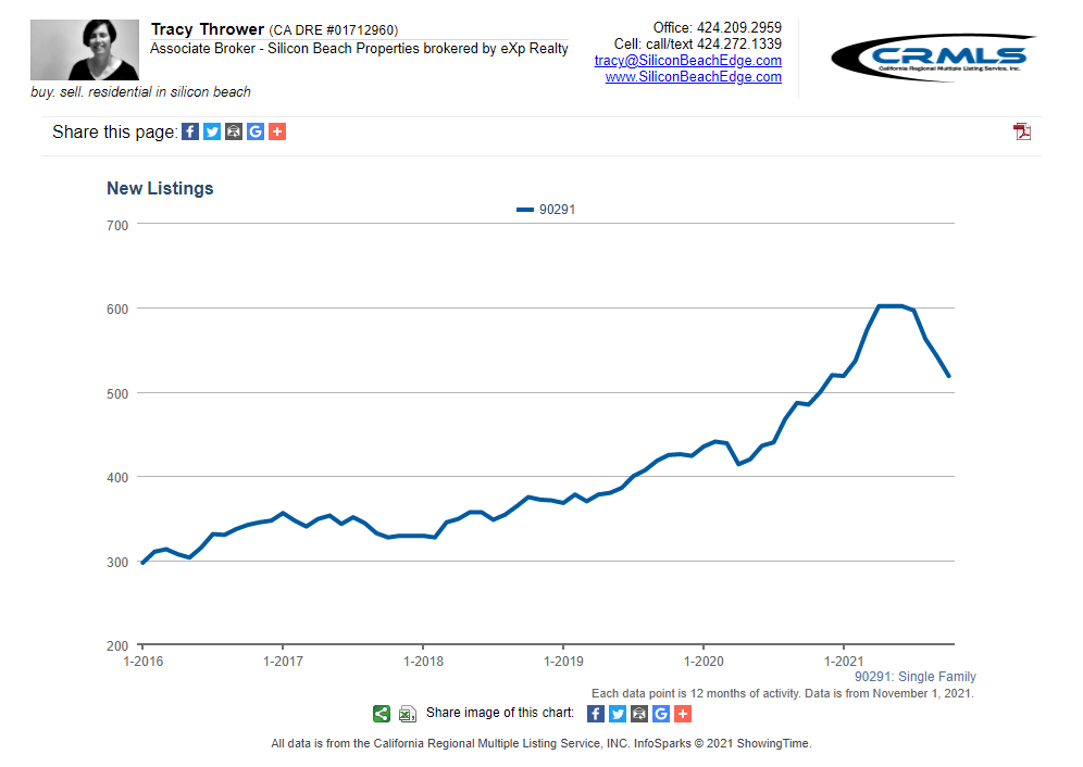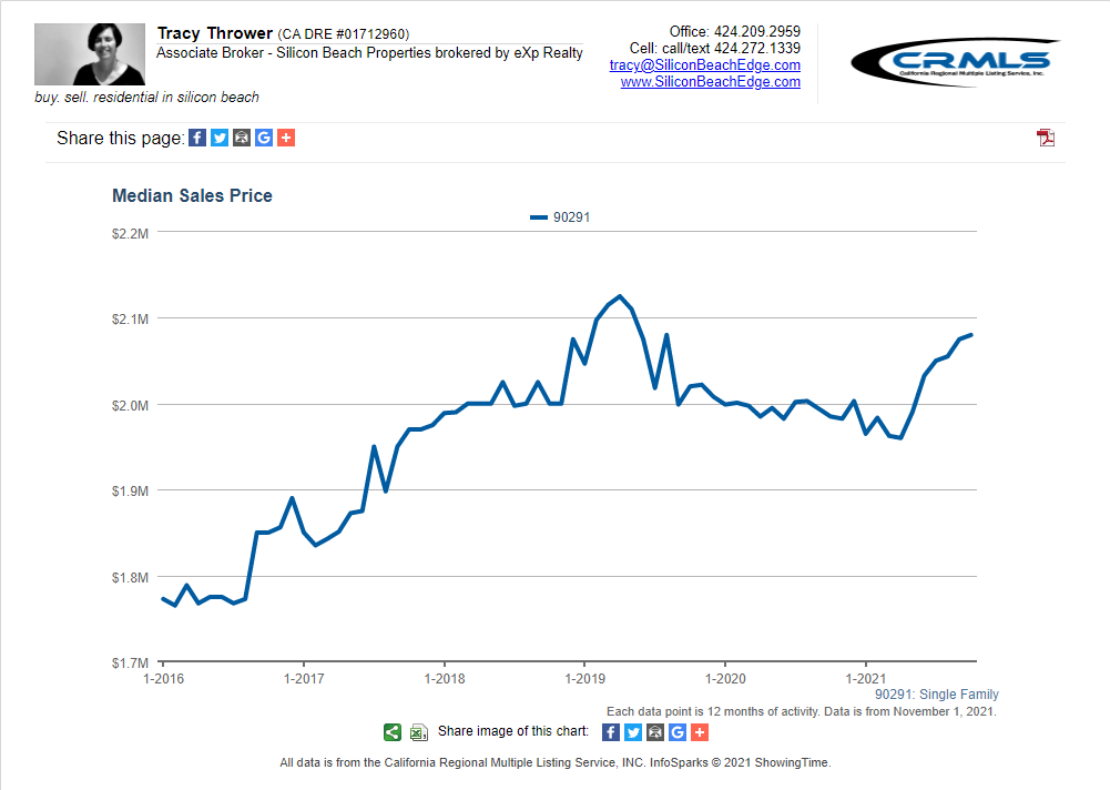 All graphs presented herein show data for the last five years on a rolling 12-month average to smooth the bumps. The data shown is also for single-family homes. If you want condo or combined data for Venice CA 90291, or custom graphs for other areas, just ask!
