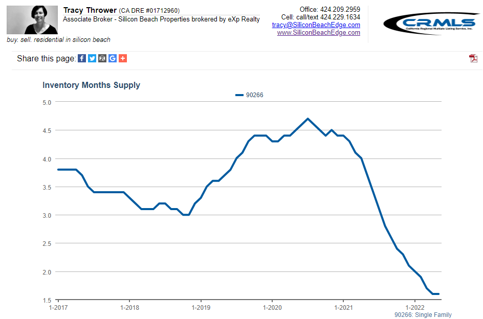 4-6 months of inventory is considered a “neutral” market where neither sellers nor buyers hold an advantage. With Manhattan Beach’s inventory holding steady at about 1.6 months, I would call Manhattan Beach a “super sellers’ market.” If nothing else were to come on the market, Manhattan Beach would run out of homes for sale in 1.6 months.