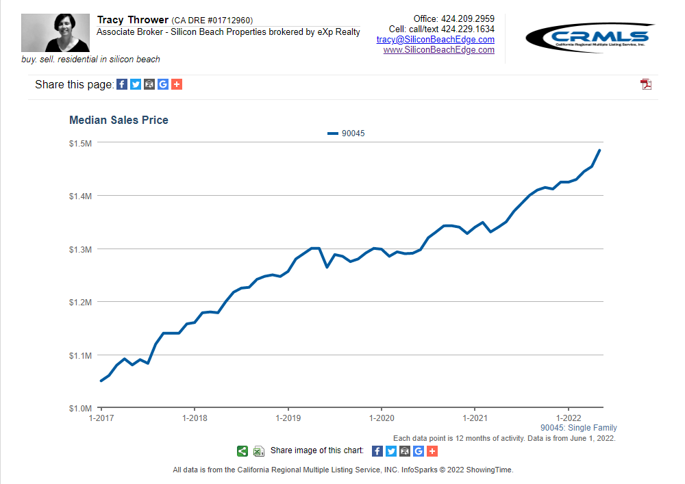 All graphs presented herein show data for the last five years on a rolling 12-month average to smooth the bumps. The data shown is also for single-family homes. If you want condo or combined data for Westchester 90045, or custom graphs for other areas, just ask!