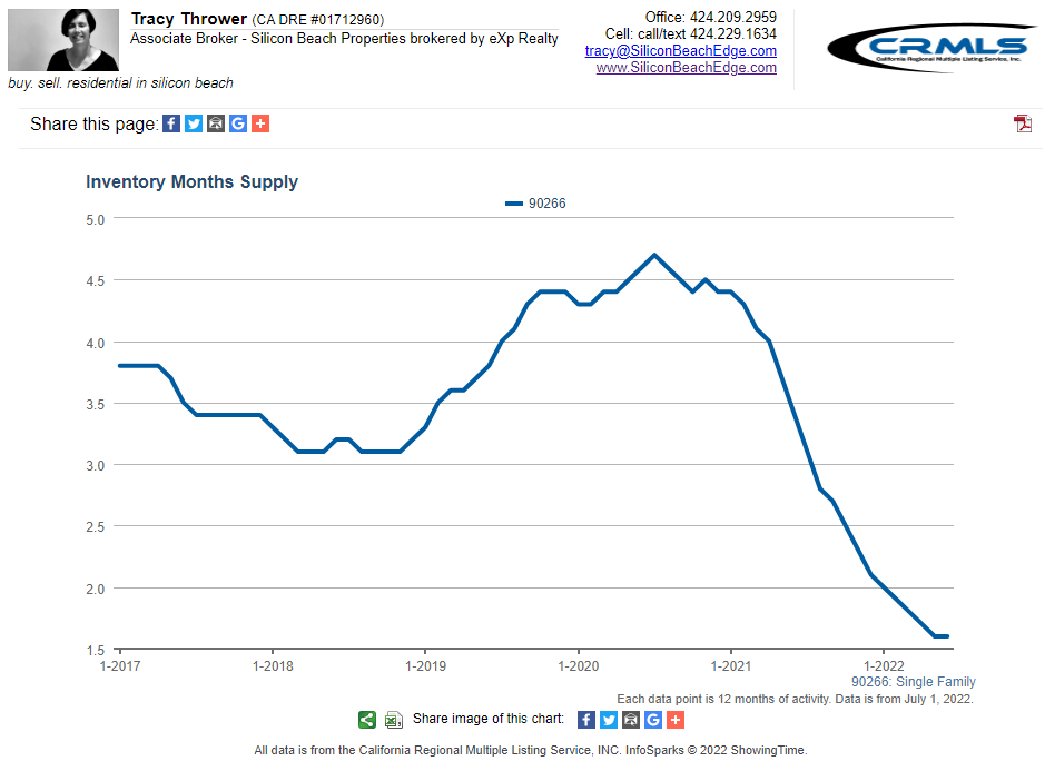 4-6 months of inventory is considered a “neutral” market where neither sellers nor buyers hold an advantage. Even though inventory is up month over month, Manhattan Beach’s inventory is holding steady in the bigger picture at about 1.6 months. Manhattan Beach continues to be a “super sellers’ market.” With luck, Manhattan Beach will continue its three month trend of increasing inventory and buyers will see some relief.