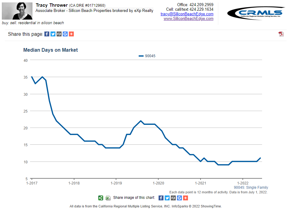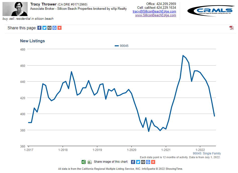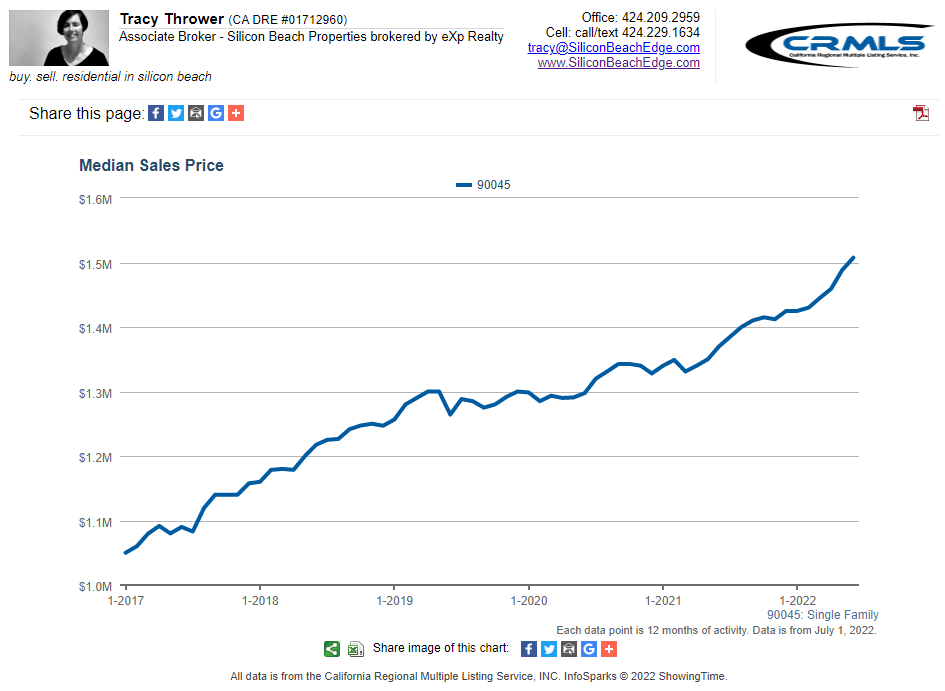 All graphs presented herein show data for the last five years on a rolling 12-month average to smooth the bumps. The data shown is also for single-family homes. If you want condo or combined data for Westchester 90045, or custom graphs for other areas, just ask!
